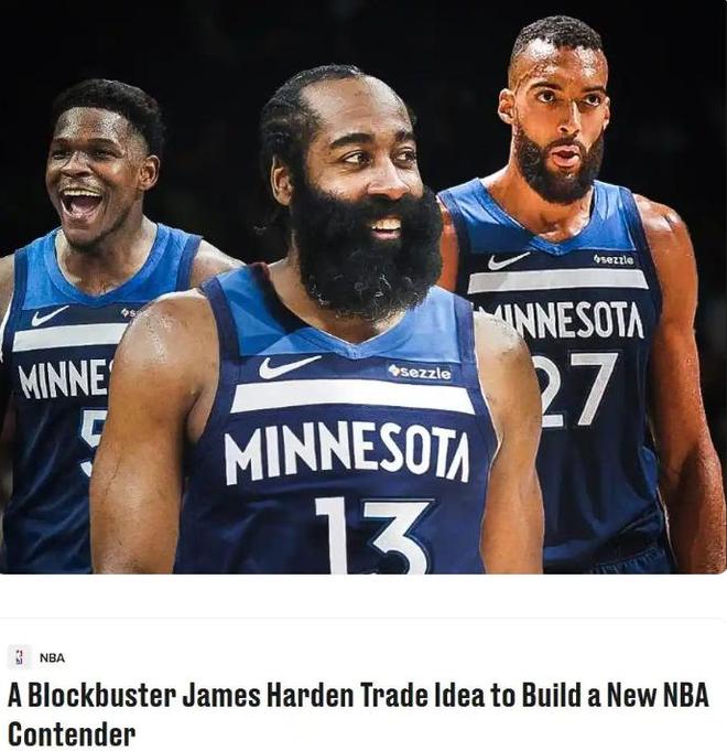 美国知名体育媒体《Bleacher Report》抛出了一套史诗级的三方交易方案,提议哈登前往森林狼联手安东尼-爱德华兹,再次冲击总冠军,具体方案为: